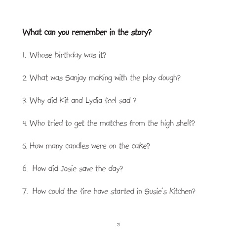 What can you remember in the story?1. Whose birthday was it?2.What was Sanjay making with the play dough?3. Why did Kit and Lydia feel sad ?4. Who tried to get the matches from the high shelf?5. How many candles were on the cake?6. How did Josie save the day?7. How could the fire have started in Susie%u2019s kitchen?21