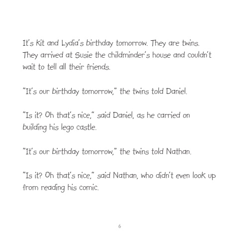 It%u2019s kit and Lydia%u2019s birthday tomorrow. They are twins. They arrived at Susie the childminder%u2019s house and couldn%u2019t wait to tell all their friends.%u201cIt%u2019s our birthday tomorrow,%u201d the twins told Daniel.%u201cIs it? Oh that%u2019s nice,%u201d said Daniel, as he carried on building his lego castle.%u201cIt%u2019s our birthday tomorrow,%u201d the twins told Nathan.%u201cIs it? Oh that%u2019s nice,%u201d said Nathan, who didn%u2019t even look up from reading his comic.6
