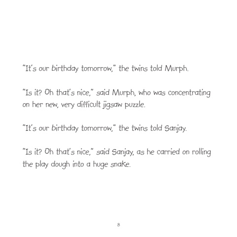%u201cIt%u2019s our birthday tomorrow,%u201d the twins told Murph.%u201cIs it? Oh that%u2019s nice,%u201d said Murph, who was concentrating on her new, very difficult jigsaw puzzle.%u201cIt%u2019s our birthday tomorrow,%u201d the twins told Sanjay.%u201cIs it? Oh that%u2019s nice,%u201d said Sanjay, as he carried on rolling the play dough into a huge snake.8