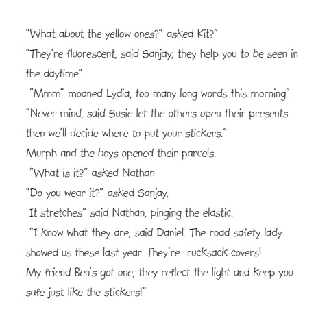 %u201cWhat about the yellow ones?%u201d asked Kit?%u201d%u201cThey%u2019re fluorescent, said Sanjay; they help you to be seen in the daytime%u201d %u201cMmm%u201d moaned Lydia, too many long words this morning%u201d. %u201cNever mind, said Susie let the others open their presents then we%u2019ll decide where to put your stickers.%u201d Murph and the boys opened their parcels. %u201cWhat is it?%u201d asked Nathan%u201cDo you wear it?%u201d asked Sanjay, It stretches%u201d said Nathan, pinging the elastic. %u201cI know what they are, said Daniel. The road safety lady showed us these last year. They%u2019re rucksack covers!My friend Ben%u2019s got one; they reflect the light and keep you safe just like the stickers!%u201d