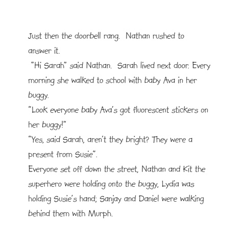 Just then the doorbell rang. Nathan rushed to answer it. %u201cHi Sarah%u201d said Nathan. Sarah lived next door. Every morning she walked to school with baby Ava in her buggy.%u201cLook everyone baby Ava%u2019s got fluorescent stickers on her buggy!%u201d %u201cYes, said Sarah, aren%u2019t they bright? They were a present from Susie%u201d. Everyone set off down the street, Nathan and Kit the superhero were holding onto the buggy, Lydia was holding Susie%u2019s hand; Sanjay and Daniel were walking behind them with Murph.