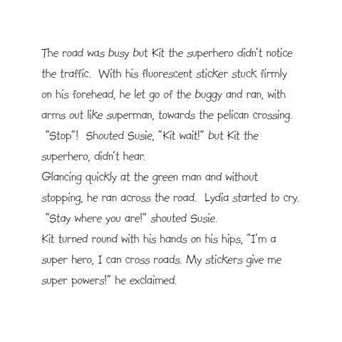 The road was busy but Kit the superhero didn%u2019t notice the traffic. With his fluorescent sticker stuck firmly on his forehead, he let go of the buggy and ran, with arms out like superman, towards the pelican crossing. %u201cStop%u201d! Shouted Susie, %u201cKit wait!%u201d but Kit the superhero, didn%u2019t hear. Glancing quickly at the green man and without stopping, he ran across the road. Lydia started to cry. %u201cStay where you are!%u201d shouted Susie. Kit turned round with his hands on his hips, %u201cI%u2019m a super hero, I can cross roads. My stickers give me super powers!%u201d he exclaimed.