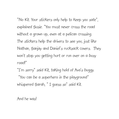 %u201cNo Kit. Your stickers only help to keep you safe%u201d, explained Susie. %u201cYou must never cross the road without a grown up, even at a pelican crossing. The stickers help the drivers to see you, just like Nathan, Sanjay and Daniel%u2019s rucksack covers. They won%u2019t stop you getting hurt or run over on a busy road!%u201d%u201cI%u2019m sorry%u201d said Kit, taking hold of Ava%u2019s buggy. %u201cYou can be a superhero in the playground%u201d whispered Sarah, %u201c I guess so%u201d said Kit. And he was!