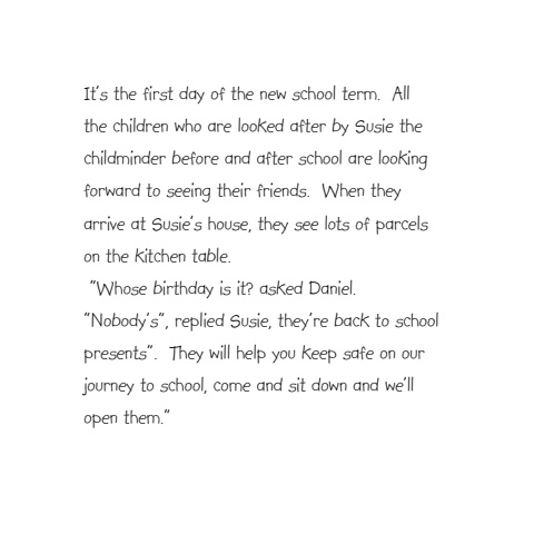 It%u2019s the first day of the new school term. All the children who are looked after by Susie the childminder before and after school are looking forward to seeing their friends. When they arrive at Susie%u2019s house, they see lots of parcels on the kitchen table. %u201cWhose birthday is it? asked Daniel. %u201cNobody%u2019s%u201d, replied Susie, they%u2019re back to school presents%u201d. They will help you keep safe on our journey to school, come and sit down and we%u2019ll open them.%u201d