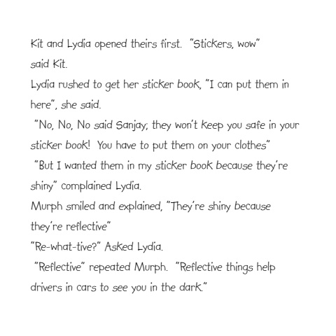 Kit and Lydia opened theirs first. %u201cStickers, wow%u201d said Kit. Lydia rushed to get her sticker book, %u201cI can put them in here%u201d, she said. %u201cNo, No, No said Sanjay; they won%u2019t keep you safe in your sticker book! You have to put them on your clothes%u201d %u201cBut I wanted them in my sticker book because they%u2019re shiny%u201d complained Lydia. Murph smiled and explained, %u201cThey%u2019re shiny because they%u2019re reflective%u201d %u201cRe-what-tive?%u201d Asked Lydia. %u201cReflective%u201d repeated Murph. %u201cReflective things help drivers in cars to see you in the dark.%u201d