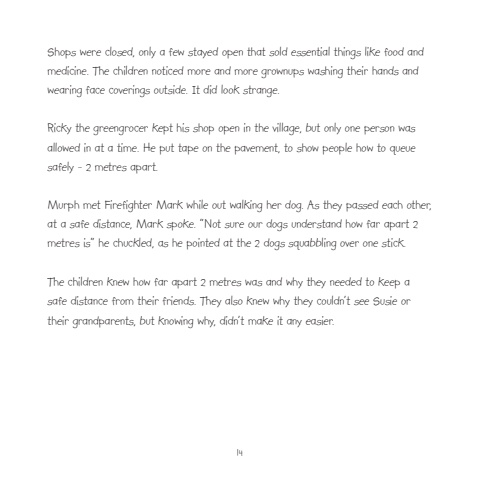 14Shops were closed, only a few stayed open that sold essential things like food and medicine. The children noticed more and more grownups washing their hands and wearing face coverings outside. It did look strange. Ricky the greengrocer kept his shop open in the village, but only one person was allowed in at a time. He put tape on the pavement, to show people how to queue safely - 2 metres apart. Murph met Firefighter Mark while out walking her dog. As they passed each other, at a safe distance, Mark spoke. %u201cNot sure our dogs understand how far apart 2 metres is%u201c he chuckled, as he pointed at the 2 dogs squabbling over one stick.The children knew how far apart 2 metres was and why they needed to keep a safe distance from their friends. They also knew why they couldn%u2019t see Susie or their grandparents, but knowing why, didn%u2019t make it any easier.