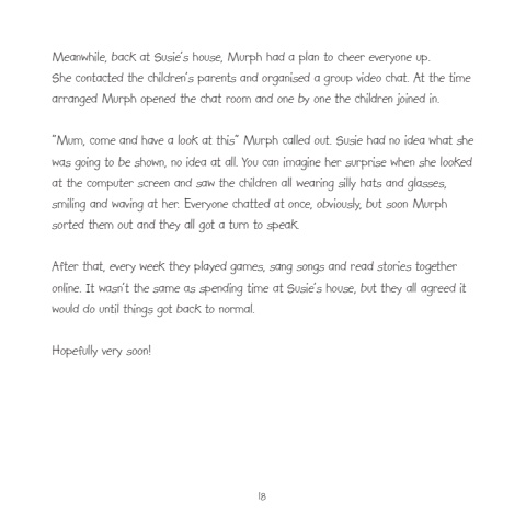 18Meanwhile, back at Susie%u2019s house, Murph had a plan to cheer everyone up. She contacted the children%u2019s parents and organised a group video chat. At the time arranged Murph opened the chat room and one by one the children joined in. %u201cMum, come and have a look at this%u201c Murph called out. Susie had no idea what she was going to be shown, no idea at all. You can imagine her surprise when she looked at the computer screen and saw the children all wearing silly hats and glasses, smiling and waving at her. Everyone chatted at once, obviously, but soon Murph sorted them out and they all got a turn to speak. After that, every week they played games, sang songs and read stories together online. It wasn%u2019t the same as spending time at Susie%u2019s house, but they all agreed it would do until things got back to normal.Hopefully very soon!
