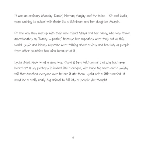 It was an ordinary Monday. Daniel, Nathan, Sanjay and the twins - Kit and Lydia, were walking to school with Susie the childminder and her daughter Murph.On the way they met up with their new friend Maya and her nanny, who was known affectionately as %u2018Nanny Cupcake,%u2019 because her cupcakes were truly out of this world. Susie and Nanny Cupcake were talking about a virus and how lots of people from other countries had died because of it.Lydia didn%u2019t know what a virus was. Could it be a wild animal that she had never heard of? If so, perhaps it looked like a dragon, with huge big teeth and a swishy tail that knocked everyone over before it ate them. Lydia felt a little worried. It must be a really really big animal to kill lots of people she thought. 6
