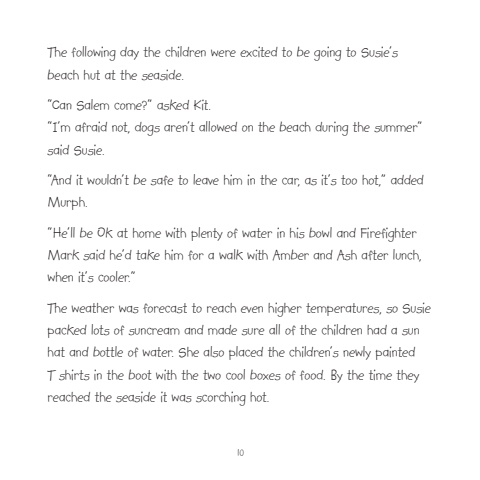 10The following day the children were excited to be going to Susie%u2019s beach hut at the seaside. %u201cCan Salem come?%u201d asked Kit.%u201cI%u2019m afraid not, dogs aren%u2019t allowed on the beach during the summer%u201d said Susie.%u201cAnd it wouldn%u2019t be safe to leave him in the car, as it%u2019s too hot,%u201d addedMurph.%u201cHe%u2019ll be Ok at home with plenty of water in his bowl and Firefighter Mark said he%u2019d take him for a walk with Amber and Ash after lunch, when it%u2019s cooler.%u201dThe weather was forecast to reach even higher temperatures, so Susiepacked lots of suncream and made sure all of the children had a sun hat and bottle of water. She also placed the children%u2019s newly painted T shirts in the boot with the two cool boxes of food. By the time they reached the seaside it was scorching hot.