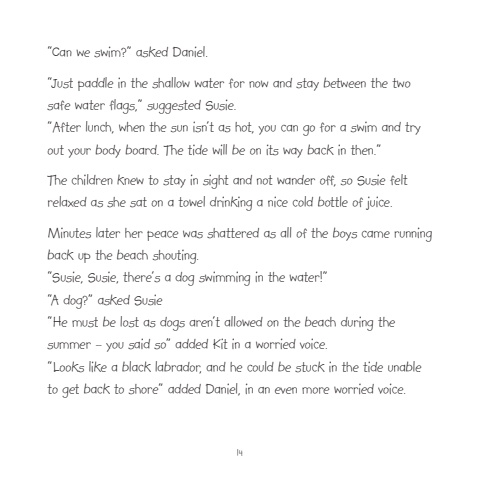14%u201cCan we swim?%u201d asked Daniel.%u201cJust paddle in the shallow water for now and stay between the twosafe water flags,%u201d suggested Susie.%u201dAfter lunch, when the sun isn%u2019t as hot, you can go for a swim and try out your body board. The tide will be on its way back in then.%u201dThe children knew to stay in sight and not wander off, so Susie feltrelaxed as she sat on a towel drinking a nice cold bottle of juice.Minutes later her peace was shattered as all of the boys came running back up the beach shouting.%u201cSusie, Susie, there%u2019s a dog swimming in the water!%u201d%u201cA dog?%u201d asked Susie%u201cHe must be lost as dogs aren%u2019t allowed on the beach during the summer %u2013 you said so%u201d added Kit in a worried voice.%u201cLooks like a black labrador, and he could be stuck in the tide unable to get back to shore%u201d added Daniel, in an even more worried voice.