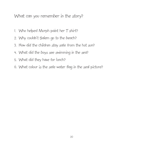 What can you remember in the story?1.Who helped Murph paint her T shirt?2.Why couldn%u2019t Salem go to the beach?3.How did the children stay safe from the hot sun?4.What did the boys see swimming in the sea?5.What did they have for lunch?6.What colour is the safe water flag in the seal picture?20