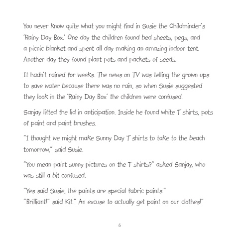 You never know quite what you might find in Susie the Childminder%u2019s %u2018Rainy Day Box.%u2019 One day the children found bed sheets, pegs, and a picnic blanket and spent all day making an amazing indoor tent. Another day they found plant pots and packets of seeds.It hadn%u2019t rained for weeks. The news on TV was telling the grown upsto save water because there was no rain, so when Susie suggested they look in the %u2018Rainy Day Box%u2019 the children were confused. Sanjay lifted the lid in anticipation. Inside he found white T shirts, pots of paint and paint brushes.%u201cI thought we might make Sunny Day T shirts to take to the beachtomorrow,%u201d said Susie.%u201cYou mean paint sunny pictures on the T shirts?%u201d asked Sanjay, whowas still a bit confused.%u201cYes said Susie, the paints are special fabric paints.%u201d%u201cBrilliant!%u201d said Kit.%u201d An excuse to actually get paint on our clothes!%u201d6