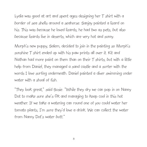 8Lydia was good at art and spent ages designing her T shirt with a border of sea shells around a seahorse. Sanjay painted a lizard on his. This was because he loved lizards, he had two as pets, but also because lizards live in deserts, which are very hot and sunny. Murph%u2019s new puppy, Salem, decided to join in the painting so Murph%u2019s sunshine T shirt ended up with his paw prints all over it. Kit and Nathan had more paint on them than on their T shirts, but with a little help from Daniel, they managed a sand castle and a surfer with the words I love surfing underneath. Daniel painted a diver swimming under water with a shoal of fish.%u201cThey look great,%u201d said Susie. %u201cWhile they dry we can pop in on NannyDot to make sure she%u2019s Ok and managing to keep cool in this hot weather. If we take a watering can round one of you could water her tomato plants, I%u2019m sure they%u2019d love a drink. We can collect the water from Nanny Dot%u2019s water butt.%u201d