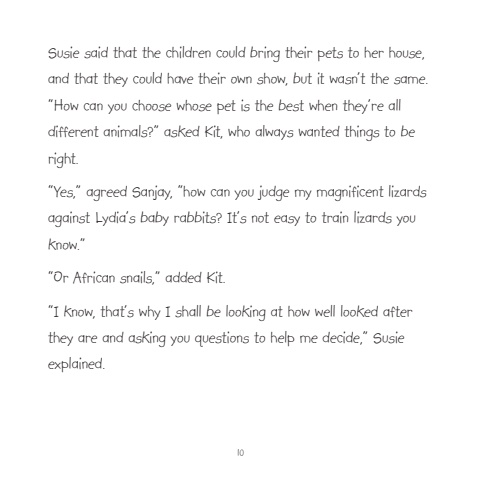Susie said that the children could bring their pets to her house, and that they could have their own show, but it wasn%u2019t the same.%u201cHow can you choose whose pet is the best when they%u2019re all different animals?%u201d asked Kit, who always wanted things to be right.%u201cYes,%u201d agreed Sanjay, %u201chow can you judge my magnificent lizardsagainst Lydia%u2019s baby rabbits? It%u2019s not easy to train lizards you know.%u201d%u201cOr African snails,%u201d added Kit.%u201cI know, that%u2019s why I shall be looking at how well looked afterthey are and asking you questions to help me decide,%u201d Susie explained.10