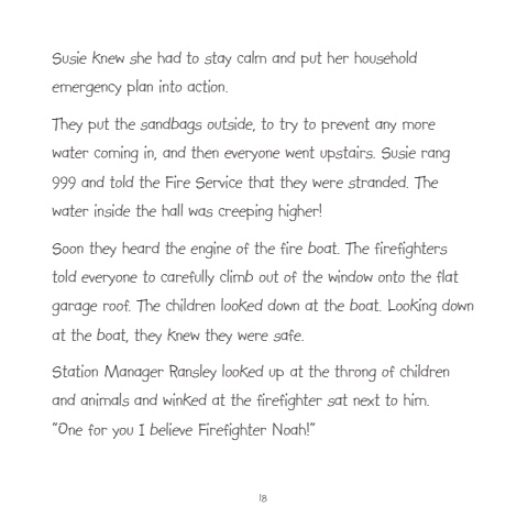 Susie knew she had to stay calm and put her household emergency plan into action.They put the sandbags outside, to try to prevent any morewater coming in, and then everyone went upstairs. Susie rang 999 and told the Fire Service that they were stranded. The water inside the hall was creeping higher!Soon they heard the engine of the fire boat. The firefighterstold everyone to carefully climb out of the window onto the flat garage roof. The children looked down at the boat. Looking down at the boat, they knew they were safe.Station Manager Ransley looked up at the throng of childrenand animals and winked at the firefighter sat next to him. %u201cOne for you I believe Firefighter Noah!%u201d18