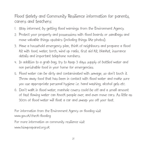 21Flood Safety and Community Resilience information for parents,carers and teachers:1.Stay informed, by getting flood warnings from the Environment Agency.2.Protect your property and possessions with flood boards or sandbags andmove valuable things upstairs (including things like photos).3.Have a household emergency plan, think of neighbours and prepare a floodkit with food, water, torch, wind up radio, first aid kit, blanket, insurance details and important telephone numbers. 4.In addition to a grab bag, try to keep 3 days supply of bottled water andnon perishable food in your home for emergencies.5.Flood water can be dirty and contaminated with sewage, so don%u2019t touch it.Throw away food that has been in contact with flood water and make sure you use appropriate personal hygiene i.e. hand washing, alcohol gels etc.6.Don%u2019t walk in flood water, manhole covers could be off and a small amountof fast flowing water can knock people over, and even move cars. As little as 30cm of flood water will float a car and sweep you off your feet.For information from the Environment Agency on flooding visitwww.gov.uk/check-floodingFor more information on community resilience visitwww.hiowprepared.org.uk