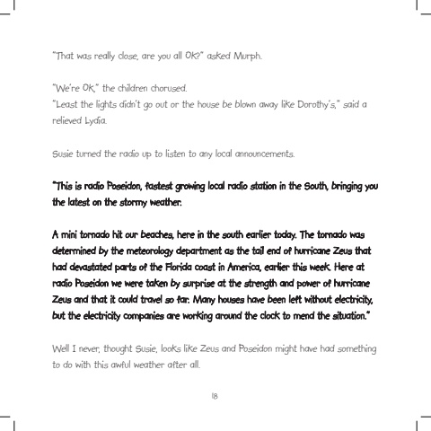18%u201cThat was really close, are you all Ok?%u201d asked Murph.%u201cWe%u2019re Ok,%u201d the children chorused.%u201cLeast the lights didn%u2019t go out or the house be blown away like Dorothy%u2019s,%u201d said a relieved Lydia.Susie turned the radio up to listen to any local announcements.%u201cThis is radio Poseidon, fastest growing local radio station in the South, bringing you the latest on the stormy weather.A mini tornado hit our beaches, here in the south earlier today. The tornado was determined by the meteorology department as the tail end of hurricane Zeus that had devastated parts of the Florida coast in America, earlier this week. Here at radio Poseidon we were taken by surprise at the strength and power of hurricane Zeus and that it could travel so far. Many houses have been left without electricity, but the electricity companies are working around the clock to mend the situation.%u201dWell I never, thought Susie, looks like Zeus and Poseidon might have had something to do with this awful weather after all.