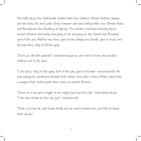 Normally Susie the childminder looked after five children; Daniel, Nathan, Sanjay and the twins Kit and Lydia. Today however she was looking after four Greek Gods and Persephone the Goddess of Spring. The children had been learning about ancient Greece and today was going to be dressing up day. Daniel was Poseidon, god of the sea, Nathan was Ares, god of war, Sanjay was Apollo, god of music and Kit was Zeus, king of all the gods.%u201cDon%u2019t you all look splendid%u201d remarked Susie as she tried to hurry the excited children out of the door.%u201cI am Zeus- king of the gods, lord of the sky, god of thunder%u201d announced Kit. He was waving his cardboard thunder bolt rather more like a Harry Potter wand than a weapon that could wreak havoc down on ancient Greece.%u201cCome on, if we get a wiggle on we might just miss the rain,%u201d interrupted Susie.%u201cI am also known as the rain god%u201d continued Kit.%u201cThat%u2019s as may be, said Susie kindly but we need to leave now, just look at those dark clouds.%u201d6