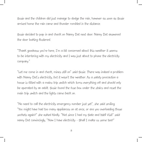8Susie and the children did just manage to dodge the rain, however as soon as Susie arrived home the rain came and thunder rumbled in the distance.Susie decided to pop in and check on Nanny Dot next door. Nanny Dot answered the door looking flustered.%u201cThank goodness you%u2019re here, I%u2019m a bit concerned about this weather it seems to be interfering with my electricity and I was just about to phone the electricity company.%u201d %u201cLet me come in and check, mines still on%u201d said Susie. There was indeed a problem with Nanny Dot%u2019s electricity, but it wasn%u2019t the weather. As a safety precaution a house is fitted with a mains trip switch which turns everything off and should only be operated by an adult. Susie found the fuse box under the stairs and reset the main trip switch and the lights came back on.%u201cNo need to call the electricity emergency number just yet%u201d, she said smiling.%u201cYou might have had too many appliances on at once, or are you overloading those sockets again?%u201d she asked kindly. %u201cNot since I had my Safe and Well Visit%u201d said nanny Dot convincingly, %u201cNow I have electricity - Shall I make us some tea?%u201d